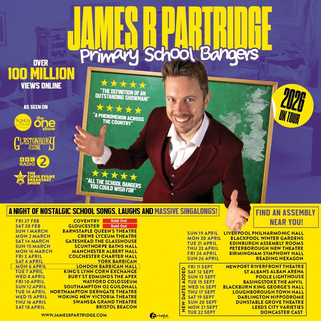 What began as a few playful social media videos of James performing iconic school songs for his students quickly turned into a nationwide sensation. These videos resonated deeply, tapping into nostalgic hearts across the UK and sparking the creation of Primary School Assembly Bangers. Since early 2023, James has brought this live school-assembly experience to stages nationwide, with viral performances at Glastonbury Festival.